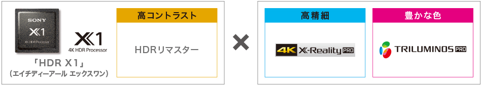 4Kの美しさを最大限に高める高画質プロセッサー「HDR X1(エイチディーアール エックスワン)」を搭載。画質の3大要素である精細感、色の鮮やかさ、コントラストを向上させるそれぞれの高画質機能をより細かくコントロールします。さらに、さまざまな映像を高コントラストなHDR相当の画質でリアルに描く「HDRリマスター」が映像の美しさを高めます。