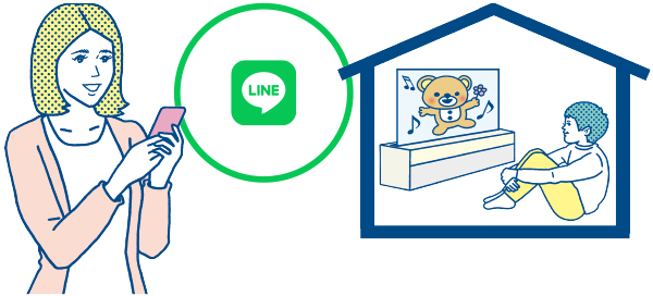 LINEを使って、留守番中の子供のテレビの見過ぎや離れて暮らす高齢者などを見守る機能。テレビの使用状況をLINEで確認したり、LINE上で入力したメッセージをテレビに直接送ったりすることができます。