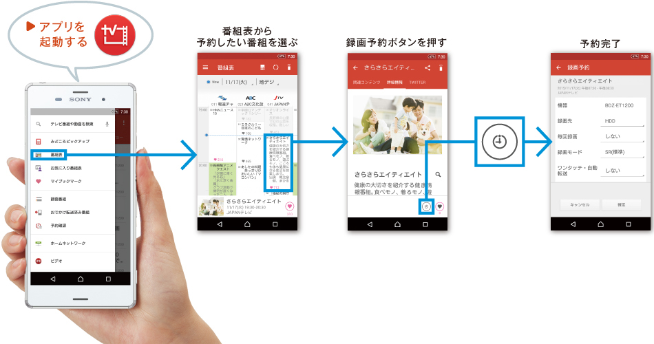 ソニーのスマートフォン向けアプリVideo & TV SideView(*)を使えば、家の中でも、外出先からでも、思い立ったそのときに録画予約できます。アプリでは、番組表だけでなく予約ランキングも確認できるので、番組の選び方が広がります。