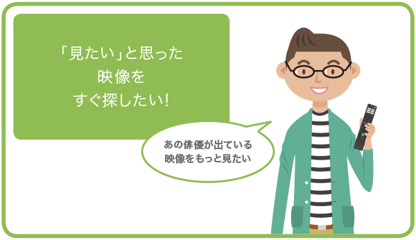 リモコンの「 Google アシスタント 」ボタンを押して、見たい映画や、好きな俳優など、気になるワードを話しかけるだけ。たとえば、俳優の名前で検索すると、その人が出演している映画や、ミュージックビデオなどをYouTube(TM)をはじめとする多数のアプリから探すことができます。もちろん、地デジなどの番組表から番組を検索することもできます。