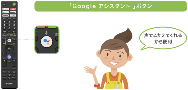 リモコンの「 Google アシスタント 」ボタンを押して会話をするように声で見たい動画を探せる「音声検索」が可能。(*)押して、話す。それだけで見たいものを検索できます。リモコン本体はスリムで持ちやすく、ボタンの文字も大きく読みやすので、よりかんたんに操作できます。
