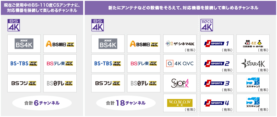 *1 BS放送がすべて視聴できている場合、現在ご使用中の衛星アンテナと伝送機器のままで、NHKと民放キー局系のBS4K放送(右旋放送)を視聴できます。さらに、すべてのBS4K放送と110度CS4K放送を受信するには、別売の4K8K放送に対応した衛星アンテナ(右左旋共用)とブースターや分配器、壁面端子、分波器などの伝送機器(3224MHz対応)が必要です