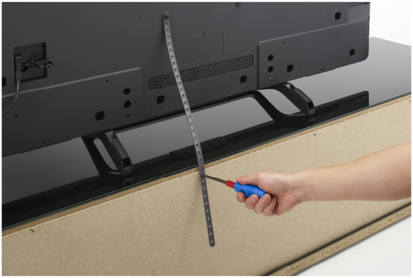 ※ 機種によって固定方法が写真と異なる場合があります。転倒防止の処置をしないと、地震などでテレビが転倒し、怪我の原因となることがあります