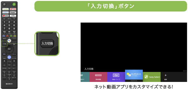 リモコン中央にある「入力切換」ボタンを押すと、画面下にネット動画アプリのアイコンが表示されます。「編集」からお気に入りのネット動画アプリの追加ができ、テレビ番組からネット動画への切り替えに便利です。