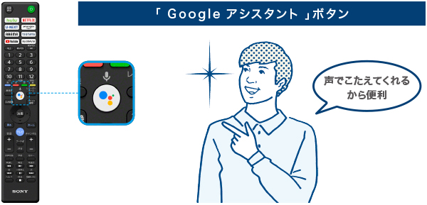 リモコンの「 Google アシスタント」ボタンを押して、会話をするように声で見たい動画を探せる「音声検索」が可能。(*)押して、話す。それだけで見たいものを検索できます。
