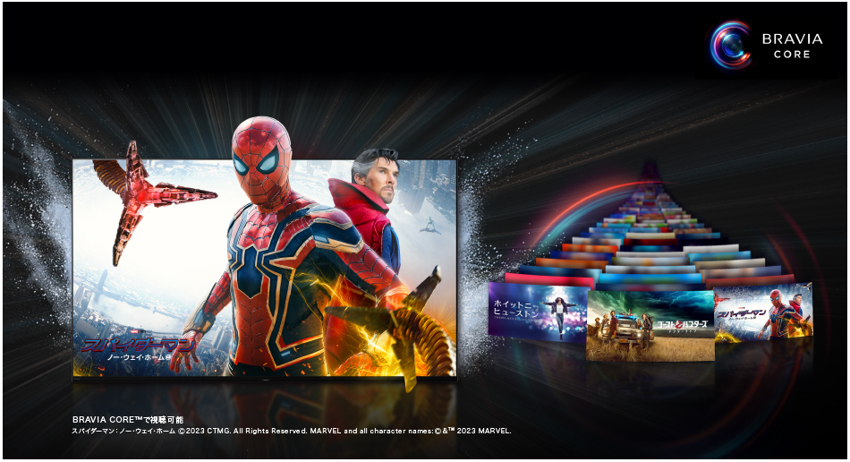 ソニー・ピクチャーズと連携して誕生したソニー独自のコンテンツサービス「SONY PICTURES CORE」。(*1)ソニー・ピクチャーズの最新作から過去の名作映画を最大2年間お楽しみいただけます。(*2)ソニー独自開発のストリーミング技術「Pure Stream(TM)」(*3)や立体音響技術「Dolby Atmos(R)」により、最高画質のストリーミングと臨場感あふれる音質でコンテンツを楽しむことができます。