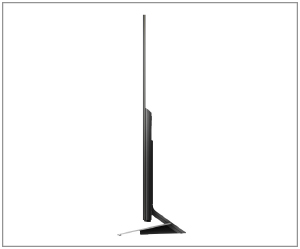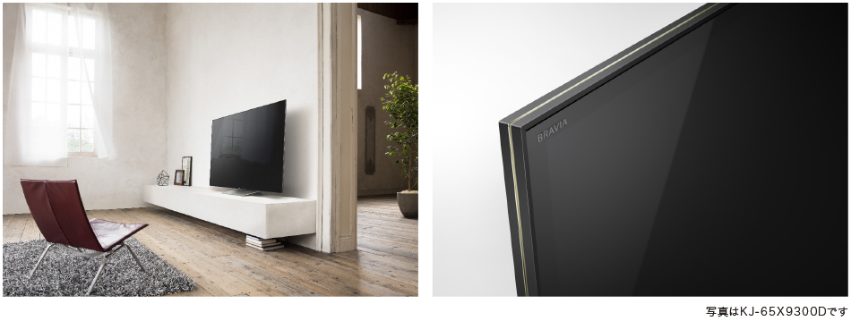 シンプルな佇まいで、さまざまなインテリアと合わせやすくリビング空間に違和感なく溶け込むデザインを追求しました。映像への没入感を高めるために画面とフレームの段差を極限まで削ぎ落としたフラッシュサーフェス、スタンドの前板は先端に向かって薄くすることでテレビ全体としての軽やかさを高めています。フレームの上面から側面にかけて入るスリットにはペール(淡い)ゴールドを採用することでアクセントを付け、リビング空間にマッチする洗練されたデザインとしています。