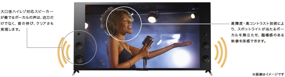 X9350Dは大口径スピーカーをテレビ前面の左右に配置し、まるで画面全体から音が出ているかのような迫力で、映像との一体感を実現しています。例えばライブ映像では、まるでボーカルが目の前で歌っているかのような今まで体感したことのない臨場感を創出します。
