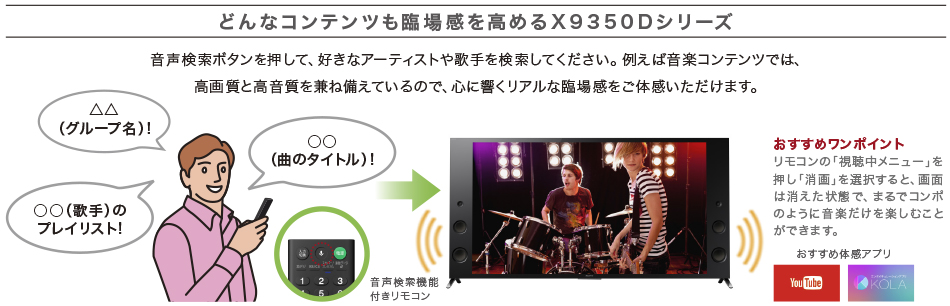大迫力な映像とハイレゾ対応スピーカーを兼ね備えたX9350Dだからこそ、Android TV機能を活用し、コンテンツをもっと楽しむことができます。