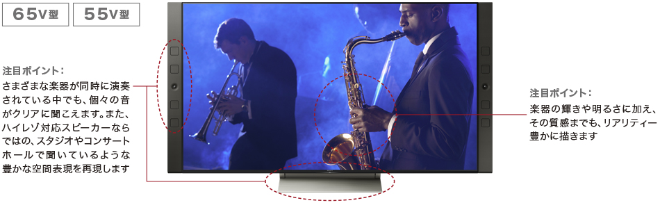ソニーのテレビ史上最高画質モデル「Z9Dシリーズ」にも搭載の4K高画質プロセッサー「X1 Extreme」が、優れた映像分析能力でパネルの映像表現力を最大限に引き出します。また、コントラスト、精細感、色の鮮やかさなどの映像のリアリティーを向上させる高画質技術と連携することで、リアリティー豊かな映像を描きます。さらにハイレゾ対応の高音質スピーカーがクリアで豊かな音を奏で、高画質映像と相まって生み出される迫真の臨場感をご体感ください。