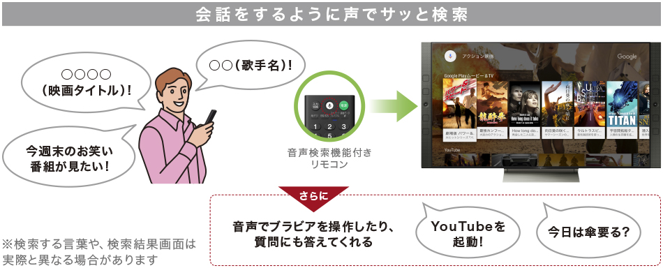 好きなコンテンツをどんどん楽しめることがAndroid TV機能を搭載したブラビアの大きな魅力の1つです。リモコンの音声検索ボタンを押して、会話をするように声で検索。動画サービスやインターネットブラウザ、その他アプリから、キーワードに適したコンテンツをまとめて検索します。そのほかにも、外付けHDDや、ソニールームリンクで接続されたブルーレイディスクレコーダーとの連携が可能になり、音声でかんたんに録画予約(*)ができます。是非店頭でご体感ください。