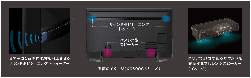 一般的な4K液晶テレビでは、画面下部にスピーカーが搭載されています。大画面になるほど映像の中心点は上がっていきますが、スピーカーは画面下部に配置されているため、映像と音の出る位置が離れてしまいます。この課題をクリアするために独自の音響技術「アコースティック マルチ オーディオ」を採用。画面下部のフルレンジスピーカーに加え、背面上部にサウンドポジショニング トゥイーターを搭載し、音の定位感を大幅に向上。まるで音が映像から聴こえるようなリアルな臨場感を味わえます。