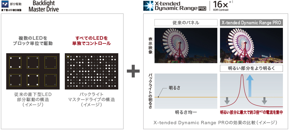 *1 XDRはX-tended Dynamic Rangeの略で、XDRコントラストはX-tended Dynamic Range PRO技術によって体感できるコントラスト水準です。この数値は、ソニー独自算出による数値で、LED部分駆動が搭載されていない当社従来液晶テレビ比です