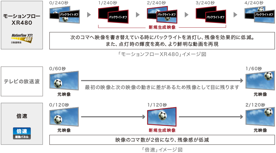 「倍速駆動パネル」に加え、バックライトオン/オフ技術の「モーションフローXR480」を搭載。映像の表示時間を8倍速(1秒間480コマ)の映像と同等にすることで、速い動きもくっきり見やすく、リアリティー豊かな映像を楽しめます。「なめらかさ」「くっきりさ」を別々に調整でき、「くっきりさ」を最大にすればサッカーなどの激しい動きを鮮明に映し出すことができます。(「くっきりさ」を最大に設定した場合、「なめらかさ」は調整できません)