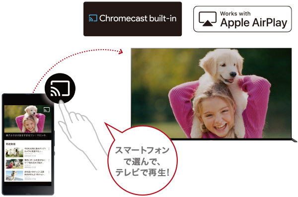 Chromecast built-inかつApple AirPlay 2に対応。ブラビアとスマートフォンを同じWi-Fiネットワークに接続し、スマートフォンに表示されるアイコンをタップすれば、Android(TM)からもiPhoneからもスマートフォンのコンテンツをあっという間に大画面にキャストできます。