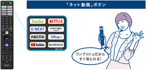 「Hulu」「Netflix」「U-NEXT」「Prime Video」「ABEMA」「Disney+」「YouTube 」「My BRAVIA」ボタン搭載で、テレビの電源がオフの状態でも、ワンプッシュでかんたんにアプリを起動できます。