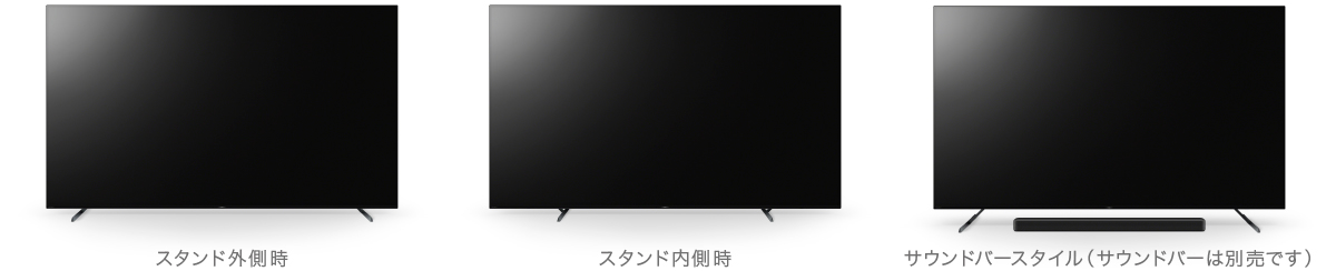 設置環境に合わせたフレキシブルな設置が可能な3-Wayスタンドを採用しました。スタンド取り付け位置を変更することで、外側と内側、そしてサウンドバー(別売)を画面に重なることなく設置できるサウンドバースタイルになります。