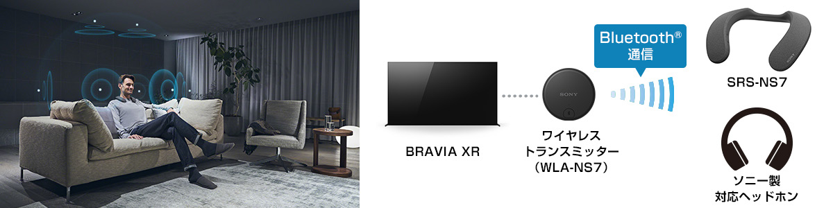 BRAVIA XR(TM)とワイヤレストランスミッター(SRS-NS7同梱)を接続し、SRS-NS7や対応ヘッドホンを接続することで、周りの環境を気にせずに、前後左右を中心とした従来のサラウンド音場に高さ方向の表現力を加えた立体音響で、映像をお楽しみいただけます。