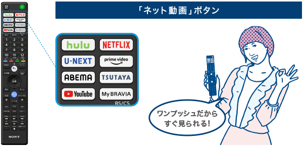 「Hulu」「Netflix」「U-NEXT」「Prime Video」「ABEMA」「TSUTAYA TV」「YouTube 」「My BRAVIA」ボタン搭載で、テレビの電源がオフの状態でも、ワンプッシュでかんたんにアプリを起動できます。