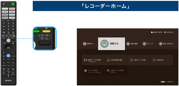 リモコンの「レコーダーホーム」ボタンから、ソニーのブルーレイディスクレコーダーのホーム画面にワンプッシュで移動でき(*2)、そのまま画面上の操作ができます。
