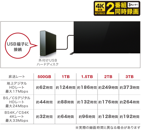 地上放送/BS・CS/BS4K・CS4K、3チューナー搭載なので、番組を見ながら、2K放送でも、4K放送でも、同時刻に放送中の別の2番組を外付けUSBハードディスク(別売)に録画することができます。