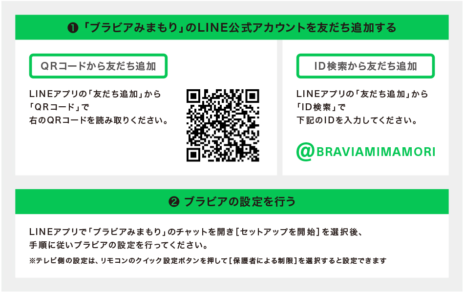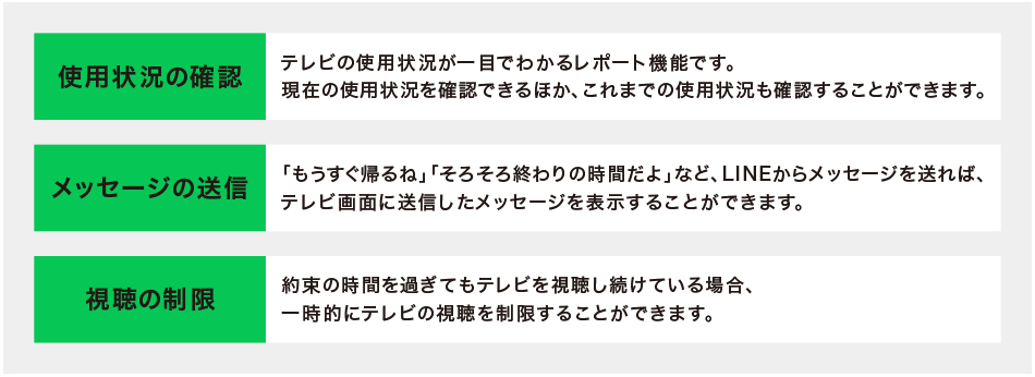 LINEを使って、留守番中の子供のテレビの見過ぎや離れて暮らす高齢者などを見守る機能。テレビの使用状況をLINEで確認したり、LINE上で入力したメッセージをテレビに直接送ったりすることができます。