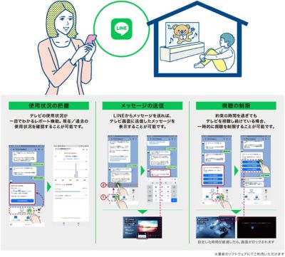 LINEを使って、留守番中の子供のテレビの見過ぎや離れて暮らす高齢者などを見守る機能。テレビの使用状況をLINEで確認したり、LINE上で入力したメッセージをテレビに直接送ったりすることができます。