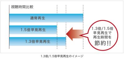 音声を流したまま1.3倍/1.5倍の早さで再生します。番組を短い時間で視聴できます。