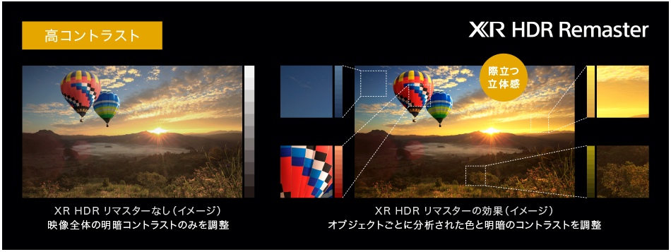 ソニー独自のアルゴリズムに基づき、映像の暗い部分の電流を明るい部分に集中。さらに、認知特性プロセッサー「XR」がエリアごとに映像を分析することで、コントラストを向上させます。明るい部分はより明るく、暗い部分はより暗くすることで、より自然なコントラストで映像を描き出します。