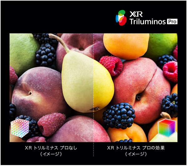 人の目に映る色は、たとえば赤といっても、バラ、紅葉、トマト、ワインなど、さまざまな赤の色合いがあります。「XR トリルミナス プロ」では、色再現領域をより一層拡大。さらに認知特性プロセッサー「XR」の新アルゴリズムにより、彩度/色相/明度を3次元で検出。その他画質要素と横断的に最適化処理を行うことで、より細部まで忠実で、人の目にとって自然な色を再現することが可能になりました。