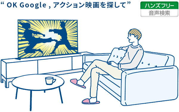 「OK Google, ○○○して」と直接テレビに話しかけることで、テレビの電源や音量コントロールなどの操作がハンズフリーで可能です。YouTube(TM)などの動画検索もハンズフリーで操作できるので、今までになく快適にテレビを視聴できます。