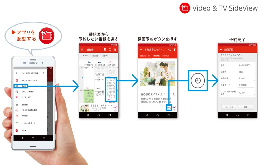 ソニーのスマートフォン向けアプリVideo & TV SideView(*)を使えば、家の中でも、外出先からでも、思い立ったそのときに録画予約できます。アプリでは、番組表だけでなく予約ランキングも確認できるので、番組の選び方が広がります。