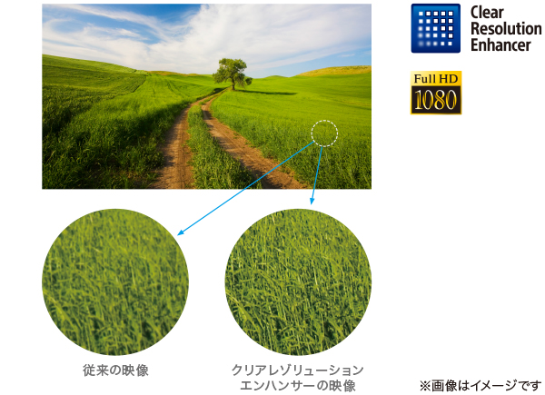 高画質技術「クリアレゾリューションエンハンサー」は自然な色合いで、ノイズの少ない映像を再現します。さらに、フルHDパネルにより、地上デジタル放送などの映像を、精細かつ、奥行きのある表現でお楽しみいただけます。