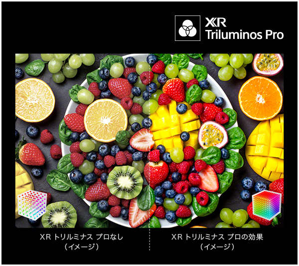 人の目に映る色は、たとえば赤といっても、バラ、紅葉、トマト、ワインなど、さまざまな赤の色合いがあります。「XR トリルミナス プロ」では、色再現領域をより一層拡大。さらにプロセッサー「XR」の新アルゴリズムにより、彩度/色相/明度を3次元で検出。その他画質要素と横断的に最適化処理を行うことで、より細部まで忠実で、人の目にとって自然な色を再現することが可能になりました。