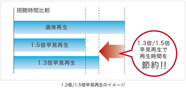 音声を流したまま1.3倍/1.5倍の早さで再生します。番組を短い時間で視聴できます。