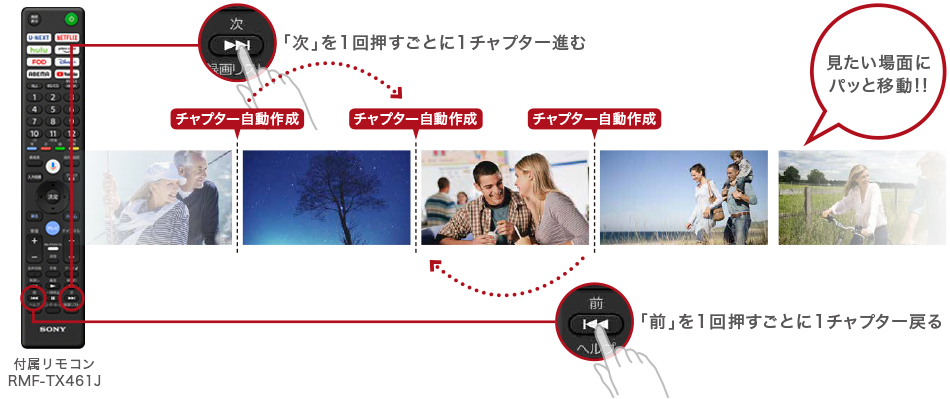 録画中の番組に、チャプター(映像の区切り)を設定します。視聴中にリモコンの「次」ボタンでチャプターを飛ばしたり、「前」ボタンでチャプターの先頭に戻ったりできます。