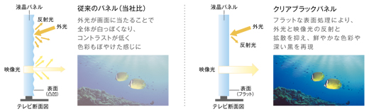 画面に当たる光の反射と拡散を大幅に低減。外光が当たることで画面がぼんやりと白っぽく見える「白ぼやけ」を最小限に抑え、高コントラストで奥行きのある映像を実現しました。また、液晶パネル内部からの映像光がパネル表面で拡散するのを抑え、映像本来の鮮やかさや、くっきりとした輪郭を再現。リアリティー豊かな映像を楽しめます。