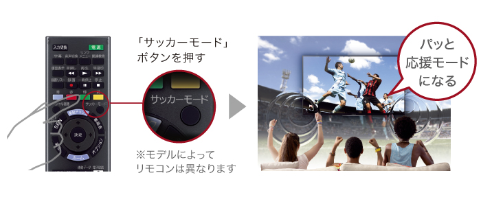 サッカーの試合を観戦中、リモコンのボタンひとつで観客の声援を強調し、スタジアムならではの音の響きを再現。サポーターの興奮と一体となって応援できます。また、サッカー関連のYouTube(TM)動画など、サッカーファンに嬉しいコンテンツも簡単に再生できます。
