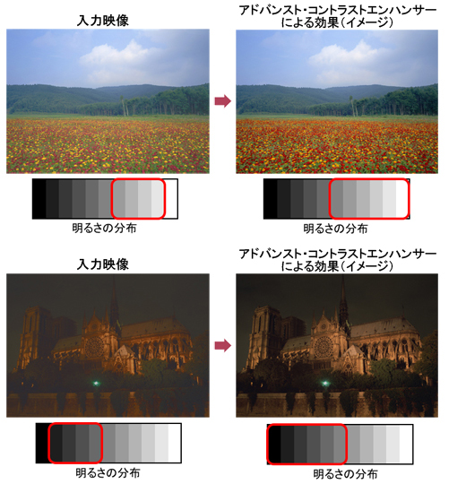 演算処理能力の向上により、入力信号をよりきめ細かに解析し最適なバックライト制御を実現しました。明るい部分は、必要な明るさを残しつつ、従来まで再現が難しいとされていた暗い映像においては、暗い部分は本来の黒を表現することで、より豊かな階調性と奥行き感を再現しました。