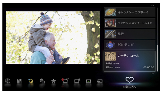視聴中のテレビ画面を少し縮小し、画面の下部に再生可能なカテゴリーや各種機能アイコンを配置。