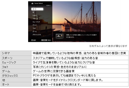 番組のジャンルや接続機器に合わせて画質モードと音質モードを自動で切り替えます。たとえば、スポーツから映画へチャンネルを切り替えた時に、それぞれの番組に最適な画質、音質モードへ自動で切り替え。煩わしい操作をすることなく、常に最適なモードでテレビを楽しめます。