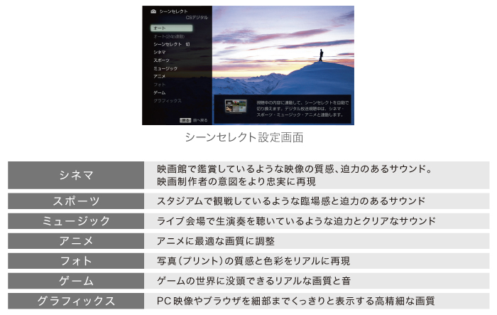 リモコンのボタンひとつで、番組のジャンルや接続機器に合わせた画質・音質モードに自動で切り替わる「シーンセレクト」には7種類の設定が可能。また、地上デジタル・BS・110度CS デジタルと外部入力ごとに設定の登録・保存ができます。