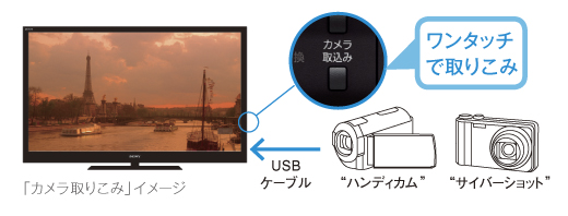 デジタルハイビジョンビデオカメラ“ハンディカム”やデジタルスチルカメラ“サイバーショット”で撮影した動画や写真をUSBケーブル(別売)などで接続して、ハイビジョン画質のまま、〈ブラビア〉本体のハードディスクにかんたんに取りこめます(*1)(*2)。