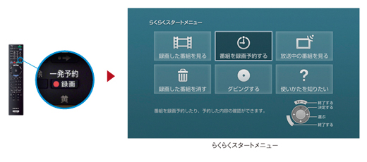 「らくらくスタート」ボタンを押すと、テレビ画面に「らくらくスタートメニュー」を表示。番組の予約や、録画した番組の再生などをガイド付きでかんたんに操作できます。