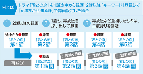 「x-おまかせ・まる録」や「番組名予約」の設定時、同じ番組の同一話の重複録画をかしこく回避します。