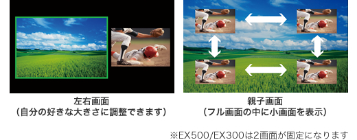テレビの映像+外部入力の映像を映しだせます。たとえばゲームをしながら、野球中継も楽しめます。