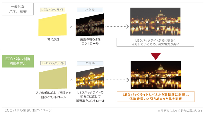 バックライト制御により、消費電力をカット。消費電力の低減だけではなく、高コントラスト化にも貢献します。