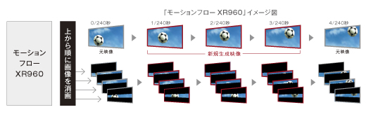 LED部分駆動のバックライトを高精度に制御し、上から順に細かく消灯/点灯します。映像の表示時間を16倍速(1秒間960コマ)の映像と同等にすることで、スポーツなどで動きのあるコンテンツを、残像感を大きく低減したクリアな映像で楽しめます。