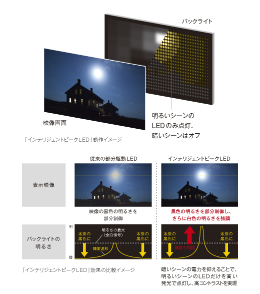 演算処理能力の向上により、入力信号をよりきめ細かに解析し最適なバックライト制御を実現しました。明るい部分は、必要な明るさを残しつつ、従来まで再現が難しいとされていた暗い映像においては、暗い部分は本来の黒を表現することで、より豊かな階調性と奥行き感を再現しました。
