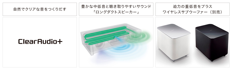ソニー独自のオーディオ技術を注ぎ込んだデジタル信号処理技術「ClearAudio+」を搭載。豊かな中低音域を再現するロングダクトスピーカーとあわせてクリアで伸びのある音場をつくりだし、まるでその場にいるかのような感覚を体感できます。また、ワイヤレスサブウーファー(別売)を追加することで重低音をプラス、更なる迫力のサウンドを楽しめます。